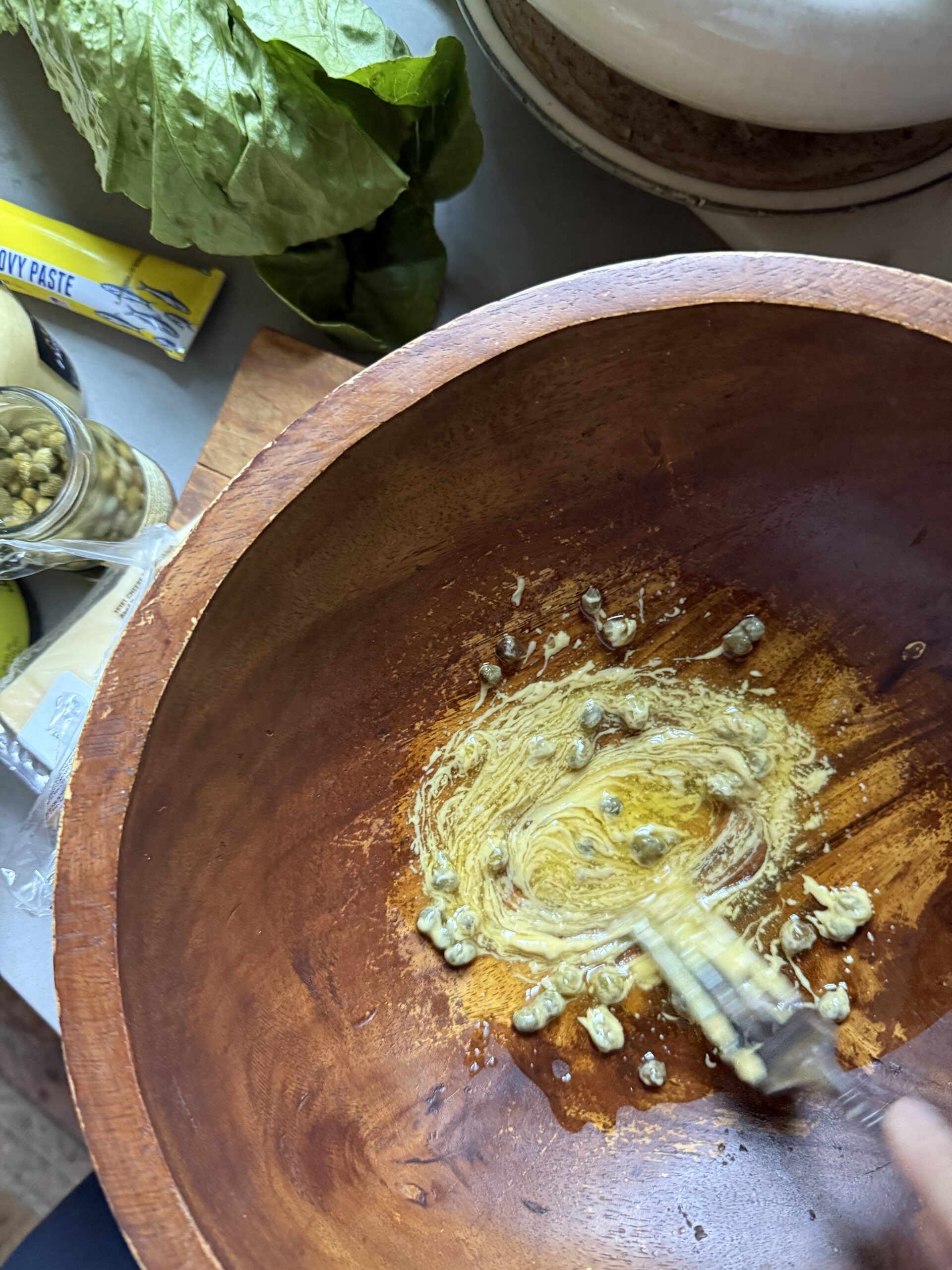 Whisk gently until the dressing emulsifies. Taste and adjust. A bit more vinegar if it needs brightness, a touch more olive oil if you prefer a softer finish. Smash the capers with a fork to get all the flavor out and at the end it almost forms a thick paste like consistency, perfect for coating the lettuce leaves. I like to make this ahead and have it sit for a minute, in a paste-like form with the grated cheese worked in so all of the flavors meld well together.