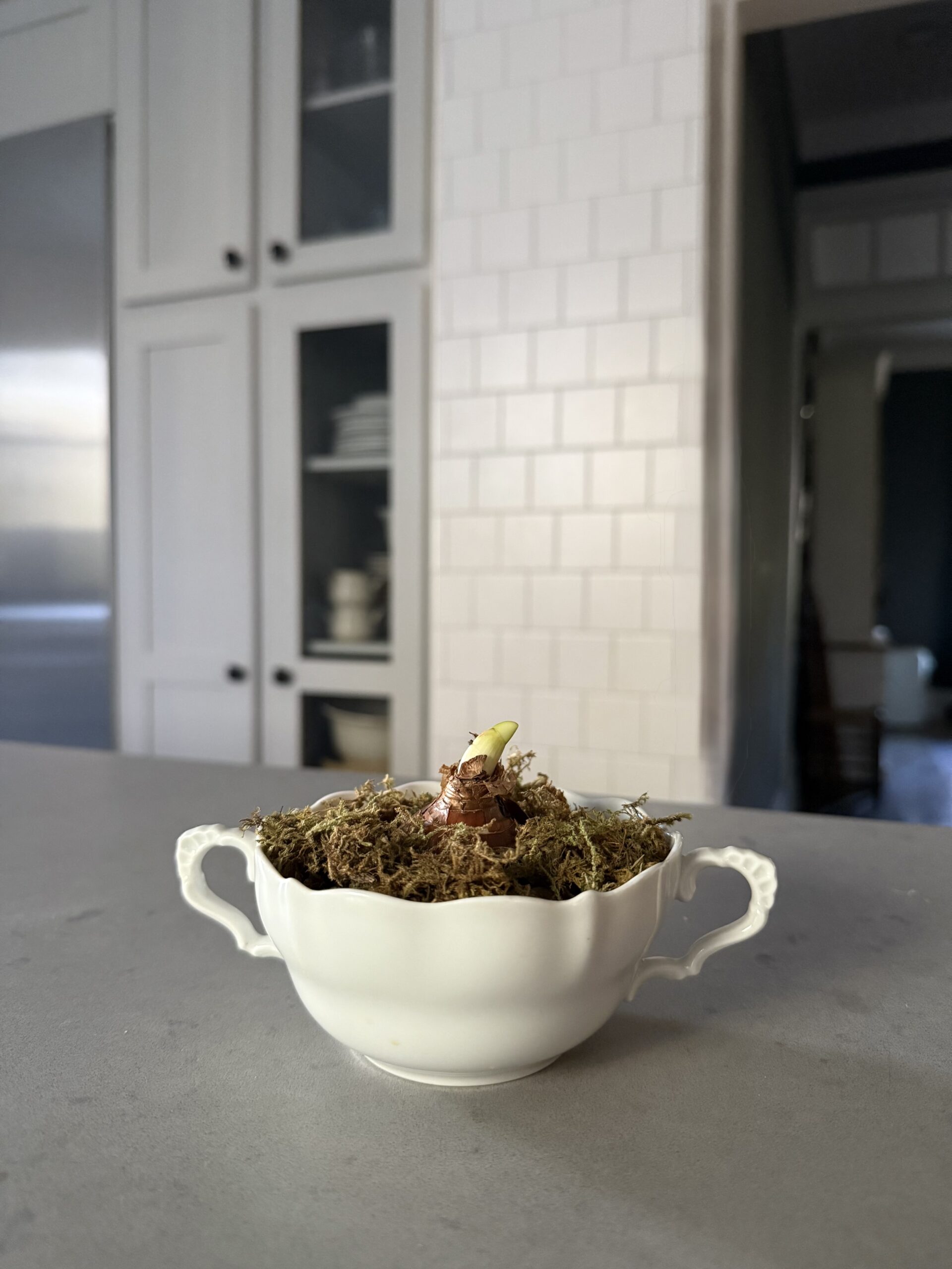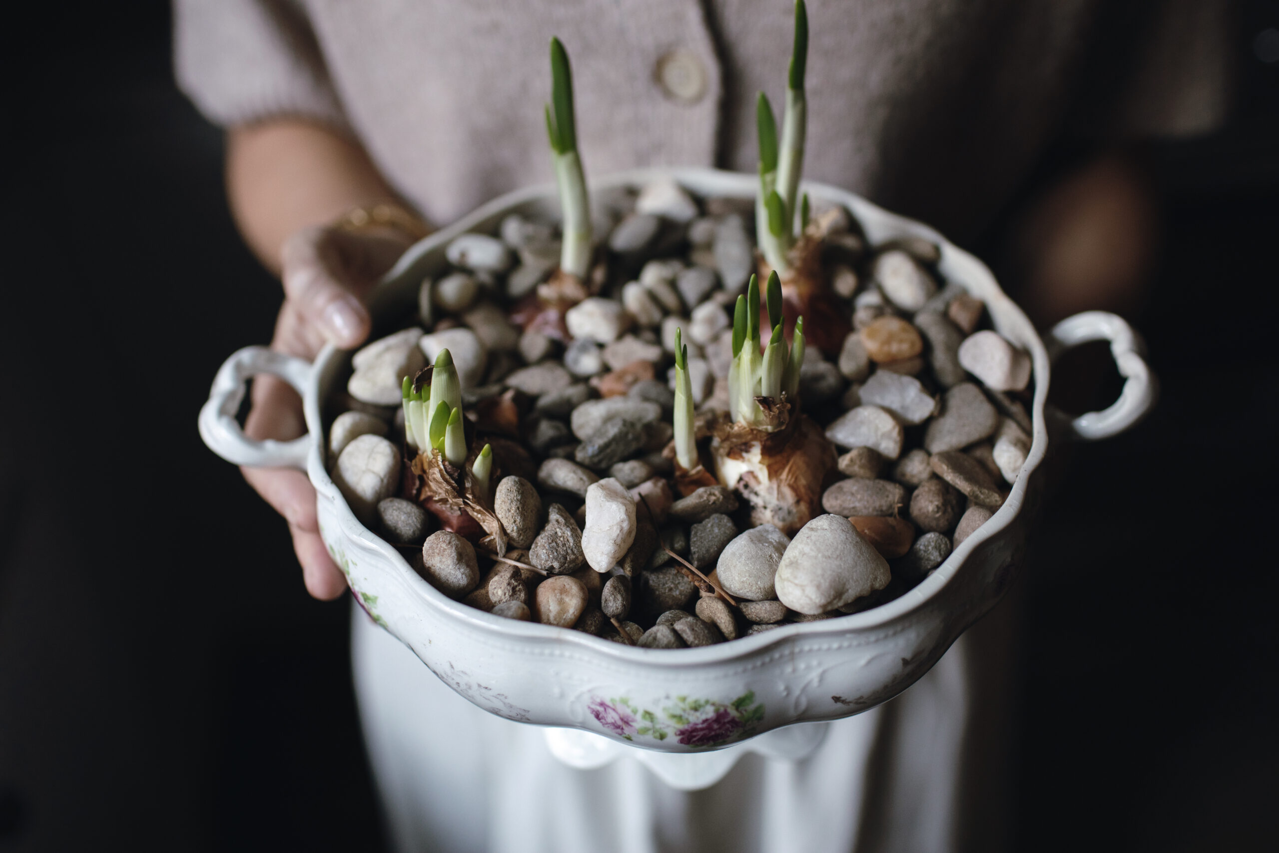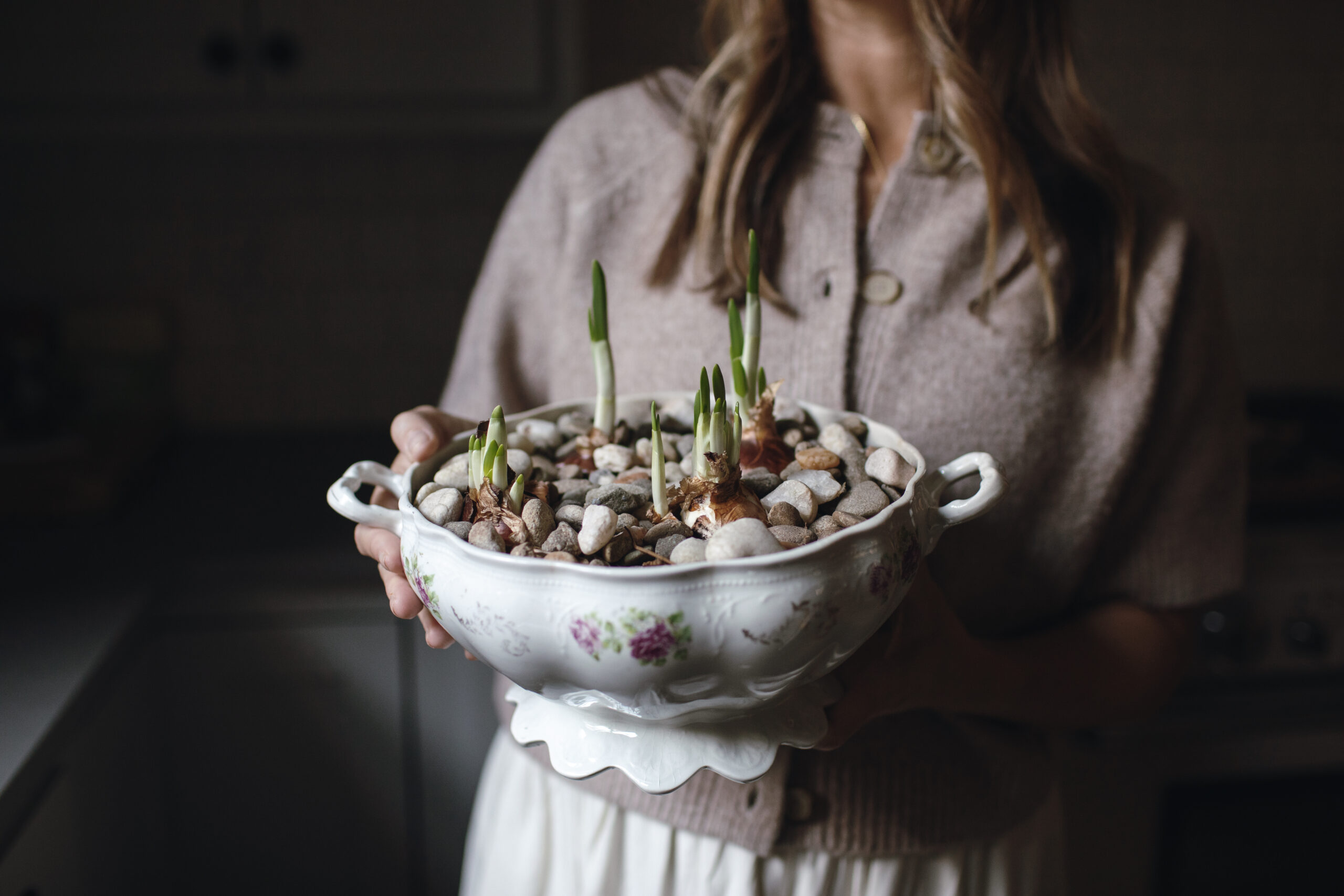 One of my favorite parts of planting paperwhites indoors is choosing the container. Gardening with vintage pieces has given so many of my collected vessels a new sense of purpose. A vintage teacup that once sat on a shelf now blooms on the breakfast table. A vintage tureen that felt too precious to use becomes the centerpiece of winter gatherings.