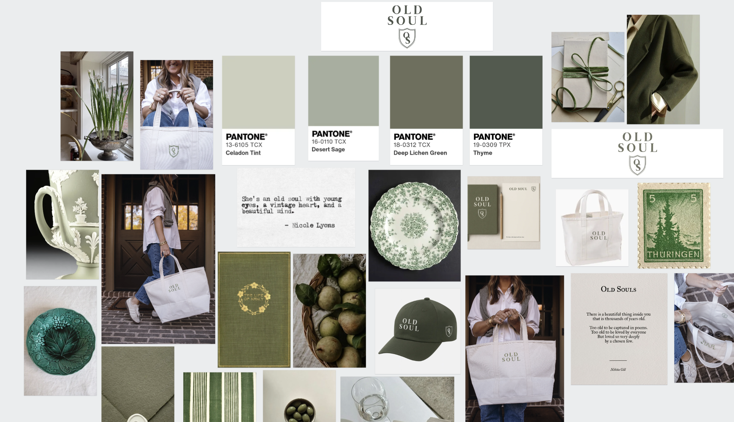 You’ll see it carried through in a soft olive and sage green palette, colors that feel grounded, patinaed, collected, and timeless.