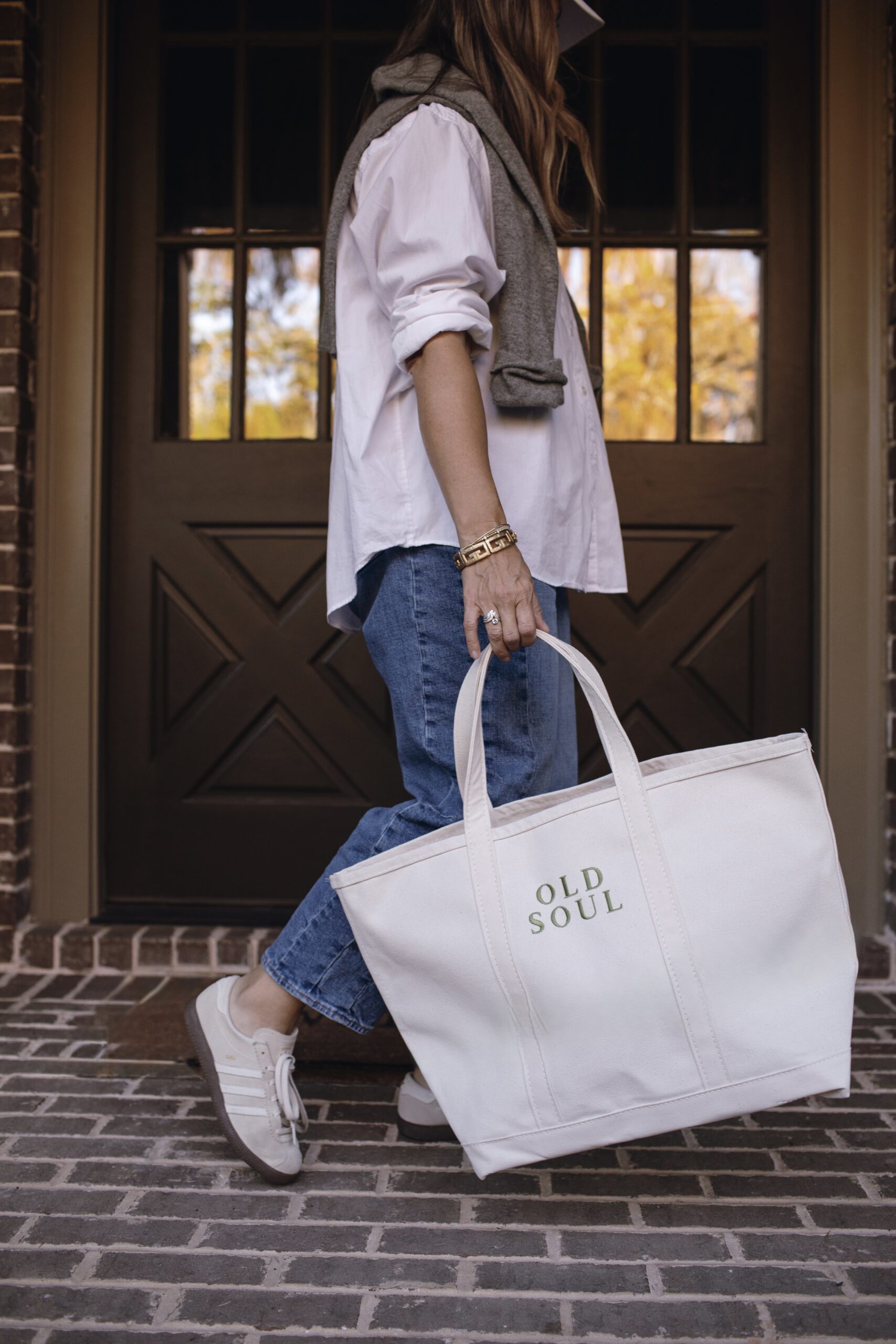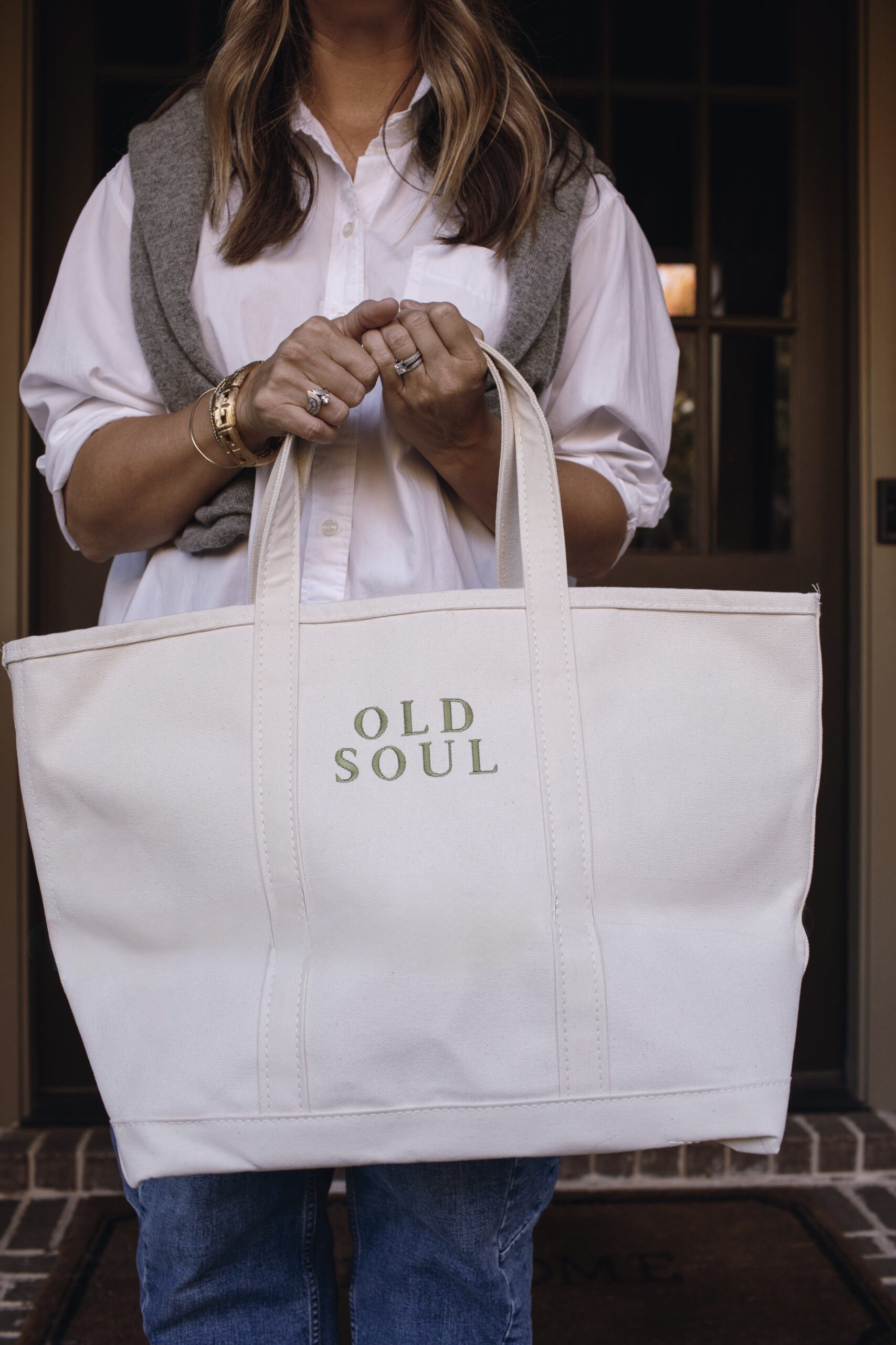 In many of the images you’ll see here, I’m carrying a large boat and tote bag embroidered with the words Old Soul and our new OS crest on the reverse side — one that has quickly become my companion while vintage sourcing and antique shopping. It’s the bag I fill with old finds, small treasures, and pieces with stories to tell. In many ways, it’s a perfect symbol of Old Soul itself.