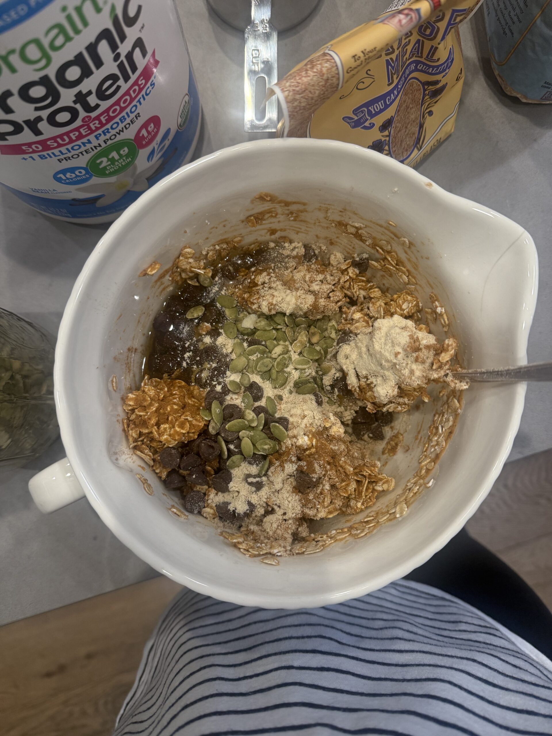 In a medium bowl, combine the oats, peanut butter, chocolate chips, ground flaxseed, shredded coconut, pumpkin seeds, protein powder, and honey.