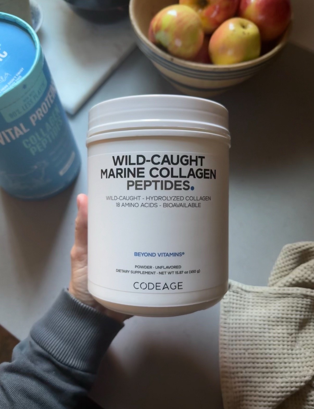 While topical skincare has helped tremendously, I truly believe the biggest changes have come from what’s happening internally. Clean eating, more water, and thoughtful supplementation have done more for my glow than any single serum ever could. I’ve always loved Vital Proteins collagen, but recently started experimenting with Codage Marine Collagen, which is said to be especially supportive for skin and nail health. I rotate between LMNT and Thorne electrolyte packets, keep a water bottle nearby at all times, and stay consistent with a probiotic for gut health, along with fish oil, w/ DHEA, and zinc chewables that support my overall system (Not medical advice and I don’t recommend adding w/o bloodwork & labs). There’s no miracle product here, just steady habits that work together.