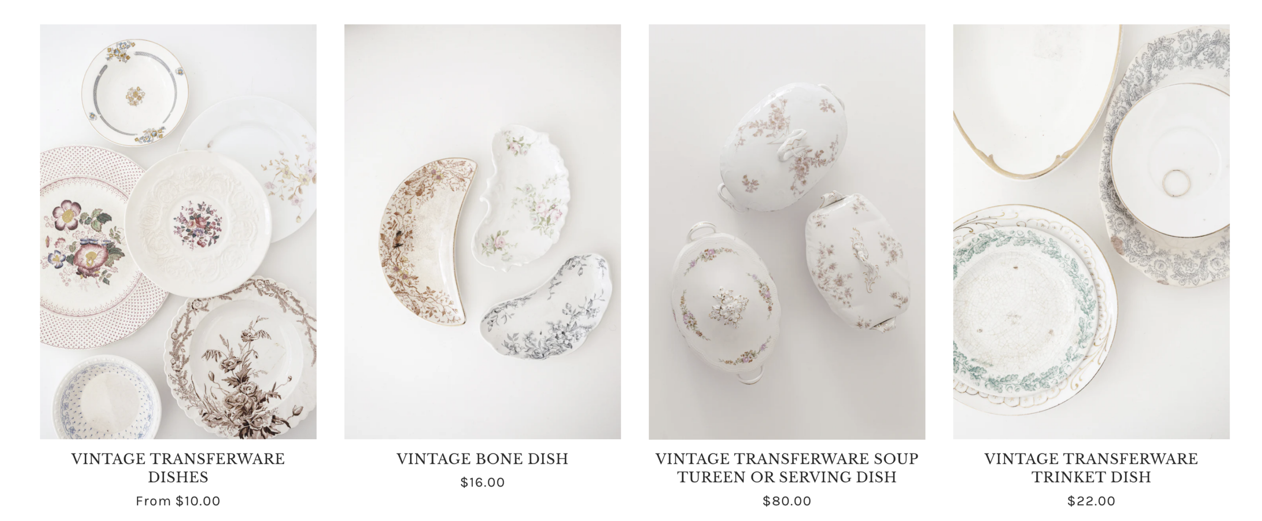 Goodwilll and estate sales are probably the best places to find transferware sets. You may be shocked at what a great price point you can find them at. You can also check Etsy or our Vintage Goods Shop which have a great assortments. One of my favorite places if you’re looking for something specific is Replacements, Ltd. Replacements has been my go-to recommendation for sourcing missing transferware pieces. Whether you are looking to replace a piece from an inherited set, or are sourcing for a specific patter, this is a wonderful place to look.